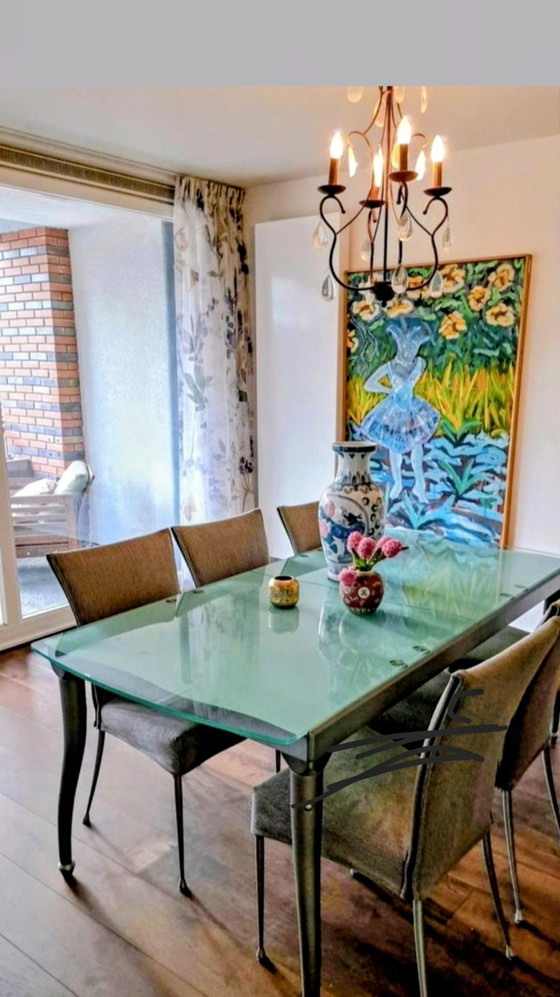 Deze elegante eethoek voor zes personen biedt een verfijnde toevoeging aan uw eetkamer. Het glazen tafelblad straalt een moderne esthetiek uit, terwijl de metalen poten zorgen voor een stevige en duurzame basis. De bijpassende stoelen zijn bekleed met een zachte textielstof, die comfort en stijl combineert.