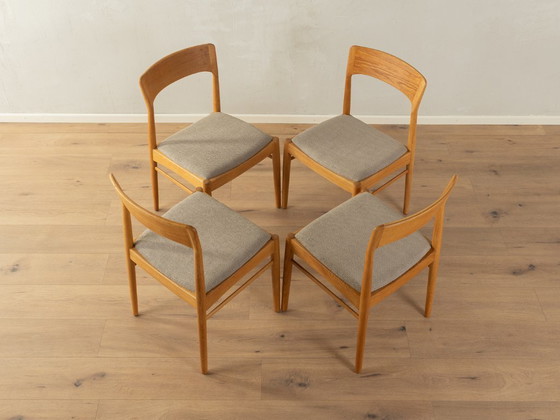 Klassieke eetkamerstoelen uit de jaren 1960. Frame gemaakt van massief eikenhout. De stoelen zijn opnieuw bekleed en bekleed met een hoogwaardige bekledingsstof in taupe. De aanbieding omvat 4 stoelen. Prachtig ontwerp: perfecte proporties en zichtbare aandacht voor detail. Hoogwaardige afwerking met eersteklas materialen. Gemaakt in Denemarken. Ontwerper: Henning Kjærnulf, fabrikant: Korup Stolefabrik (merk onder de zitting).