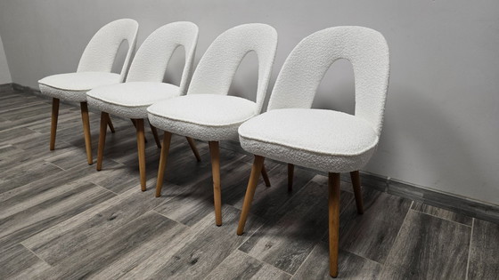 Eetkamerstoelen van Antonin Suman Ontworpen en geproduceerd in Tsjecho-Slowakije in de jaren 60 Gerestaureerd en opnieuw gestoffeerd Materiaal: bouclé