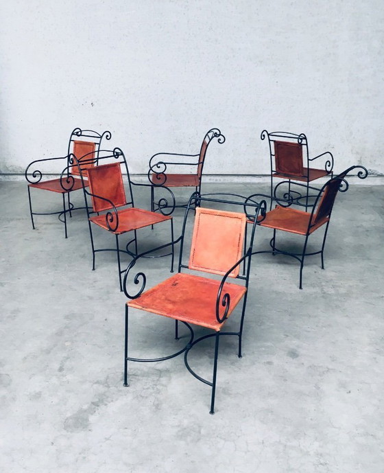 Vintage design eetkamerstoelen van smeedijzer en cognackleurig leer, set van 6, gemaakt in Spanje in de jaren 60. Wervelend smeedijzeren metalen frame met dikke cognackleurige leren zitting en rugleuning. Handgemaakt en gesmeed. Alle stoelen hebben een mooie patina op het leer door de jaren heen, wat ze veel karakter geeft. Ze zijn allemaal in zeer goede staat. Elke stoel is 86 x 49 x 67 cm groot.