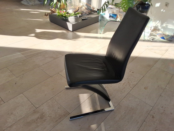 Ervaar de ultieme combinatie van comfort en stijl met deze set van vier Rolf Benz 7800 eetkamerstoelen. Deze stoelen, bekleed met hoogwaardig zwart leer, bieden niet alleen een luxueuze uitstraling maar ook een ergonomische zithouding die ideaal is voor mensen met rugklachten.