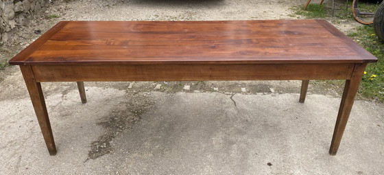 Prachtige en authentieke antieke eettafel in boerderijstijl, gemaakt van massief hout. Het tafelblad en het frame zijn vervaardigd uit verschillende houtsoorten. De poten zijn verstevigd met houten pinnen, waardoor de tafel zeer stabiel is.