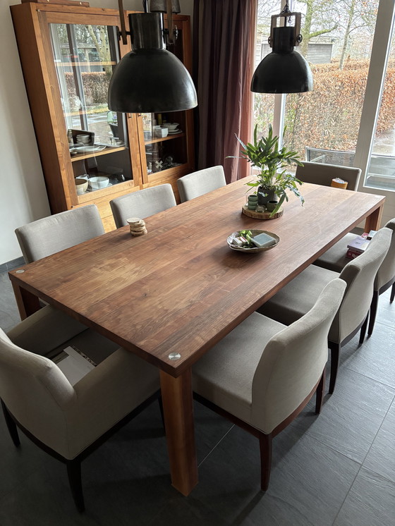 Deze prachtige eethoek, bestaande uit een robuuste houten tafel en acht elegant gestoffeerde stoelen, is een perfecte combinatie van stijl en functionaliteit. De rijke houtnerf en stevige constructie van de tafel zorgen voor een tijdloze uitstraling, waardoor het een ideaal middelpunt is voor elke eetkamer. Bij de tafel horen acht stoelen, waarvan er twee zijn voorzien van armleuningen voor extra comfort en ondersteuning tijdens langere diners.