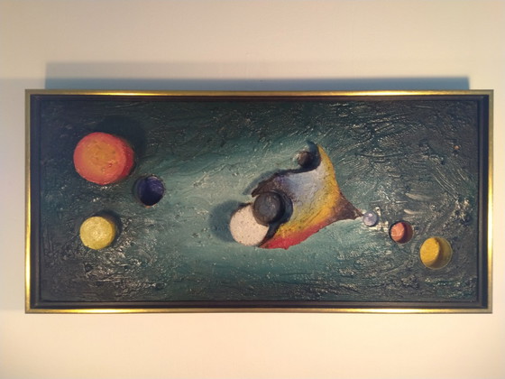 Schilderij is gemaakt op hout met verwerking andere materialen.