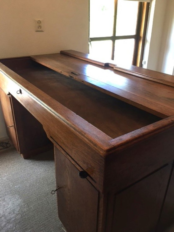 Eiken bureau met in/uitschuifbaar bovenblad. Wanneer het bovenblad open geschoven is, kan d.m.v. de metalen schuif (foto 7 + 8) het werkblad naar boven geplaatst worden en kan hierop gewerkt worden. Als je klaar bent met de werkzaamheden kan het werkblad weer d.m.v. de schuif naar beneden en het bovenblad gesloten worden. Bovenblad is afsluitbaar d.m.v. bijgeleverde sleutel. Op deze manier is je bureau altijd opgeruimd. * Het mechaniek moet even nagekeken worden. Bureau is demontabel in 3 delen: bovendeel en 2 bureaukasten.