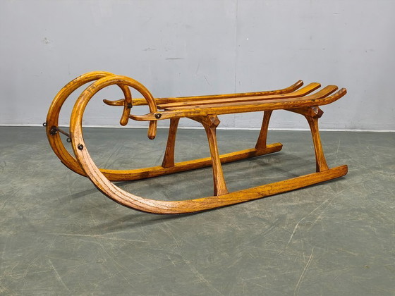 Originele houten slee uit de jaren 30 uit Tsjecho-Slowakije, vervaardigd van massief eikenhout met ijzeren beslag. Dit sculpturale object weerspiegelt traditioneel Midden-Europees houtsnijwerk, gekenmerkt door elegante gebogen houten sleden en verfijnde, handgemaakte constructie.