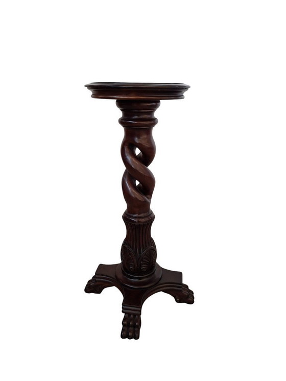 De driepotige voet is versierd met handgesneden details, terwijl de ronde bovenkant ideaal is voor het tentoonstellen van bloemenvaasjes, sculpturen, bustes of klassieke lampen. Een tijdloos meubelstuk, perfect voor entrees, woonkamers of kantoren die een vleugje warmte en klasse zoeken.