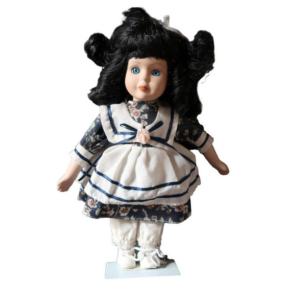 Vang de essentie van vintage verfijning met deze vintage porseleinen pop uit het midden van de 20e eeuw. Gekleed in een charmante blauw-witte jurk, heeft deze pop opvallend zwart haar en betoverende blauwe ogen, die de gratie en verfijning van een vervlogen tijdperk oproepen.