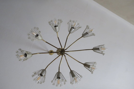 Bijzondere, grote en elegante kroonluchter van messing en glas uit de jaren 1950, waarschijnlijk Oostenrijks of Italiaans.