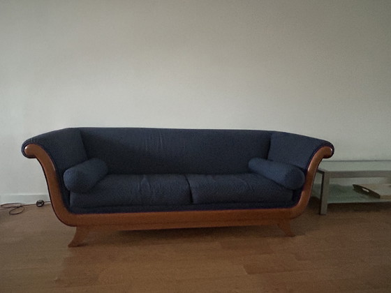 Ervaar tijdloze elegantie met deze Jaski bank in Empire-stijl. De sierlijke rondingen en de rijke blauwe bekleding creëren een ontspannen sfeer, terwijl het warme houten frame elke kamer een verfijnde uitstraling geeft. Deze bank is vervaardigd met een stevig houten frame en garandeert duurzaamheid en een elegante uitstraling. De zachte blauwe textielbekleding is zowel comfortabel als visueel aantrekkelijk, met een subtiel patroon dat de klassieke charme versterkt. Ontworpen in Empire-stijl, straalt dit meubelstuk grandeur en historische betekenis uit, perfect voor wie traditionele elegantie waardeert. Verrijk uw woonruimte met deze prachtige bank, een perfecte combinatie van comfort en stijl. Informeer vandaag nog en maak hem van u.