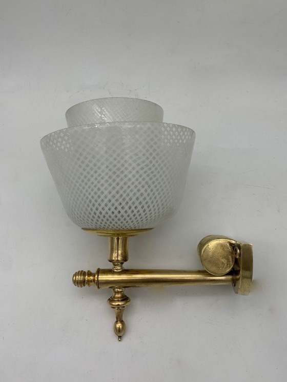 Deze wandlamp heeft een frame van warm messing en brons met een licht satijnen afwerking. De lamp is voorzien van een horizontale arm die bevestigd is aan een halfronde wandvoet, versierd met gedraaide decoratieve elementen, en een dubbele Reticello glazen diffuser die het licht zacht en gelijkmatig verspreidt. De lamp heeft een klassieke en elegante stijl, geschikt voor traditionele of verfijnde interieurs. Deze enkele wandlamp met E27 fitting is van Venini. Nieuw elektrisch systeem. De glazen panelen zijn verwijderd voor verzending. Het glas vertoont zeer lichte beschadigingen.