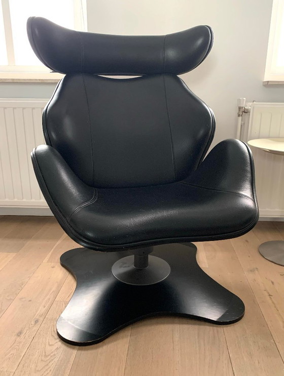 e iconische Variér Tok loungefauteuil met hocker is een ergonomisch ontwerp dat comfort en beweging combineert. De stoel is bekleed met zwart semi-aniline leder en uitgevoerd in zwart fineer. Het kantelmechanisme ondersteunt een natuurlijke zithouding en nodigt uit tot actief ontspannen. Het ontwerp is van de Japanner Toshiyuki Kita (1942).