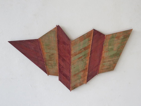 Origineel beschilderd houten wandobject. De kunstenaar Eric van Solm. Opleiding: Willem de Kooning Rotterdam, 1980-1985, afd. Plastische- en Ruimtelijke vormgeving.