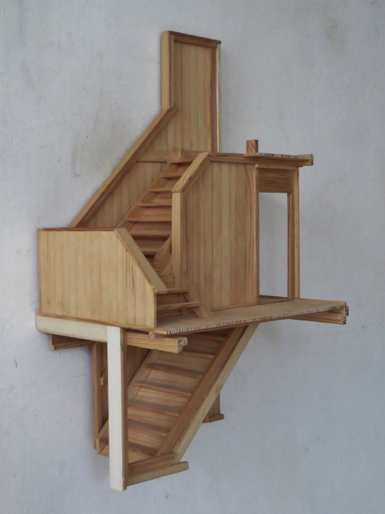 Uniek houten wandobject. ( diepte van het werk is 25 cm.) De kunstenaar is Eric van Solm. Opleiding: Willem de Kooning Rotterdam, 1980-1985, afd. Plastische- en Ruimtelijke vormgeving.