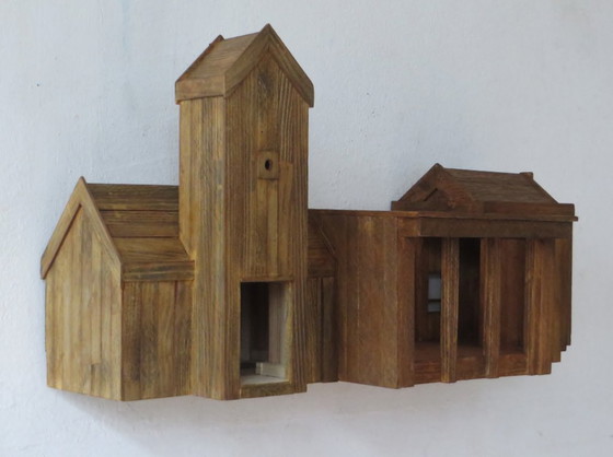 Uniek gebeitst houten wandobject. De kunstenaar Eric van Solm. Opleiding: Willem de Kooning Rotterdam, 1980-1985, afd. Plastische- en Ruimtelijke vormgeving. Geregiseerd bij R.K.D.