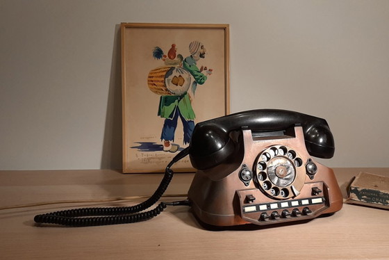 Prachtige oude Ericsson telefoon met draaischijf en knoppen, deze telefoon heeft een koperen behuizing en een hoorn gemaakt uit bakeliet, ontwerp uit de jaren 40.