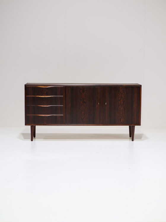 Prachtig lowboard / sideboard ontworpen door Erling Torvits voor Klim Møbelfabrik in Denemarken, jaren '60. Dit dressoir is gemaakt van donker palissanderhout met een zeer indrukwekkende houttekening. De kast heeft links vier lades met verfijnde handgrepen. Rechts zitten twee deuren met daarachter twee in hoogte verstelbare planken. Een tijdloos meubelstuk dat kwaliteit en vakmanschap uitstraalt, onder andere een ideaal formaat om te gebruiken als tv-meubel of platenkast / LP-kast.