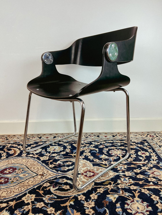 Iconische designstoel ontworpen door Eugen Schmidt in de 1960’s. Duitsland. De stoel heeft chromen sledepoten en een rugleuning, zitting in zwartgelakt plywood. De stoel zit comfortabel en is perfect te gebruiken als bureaustoel of eetkamerstoel. Een Space Age-stoel met lichte leeftijdsgerelateerde gebruikerssporen.