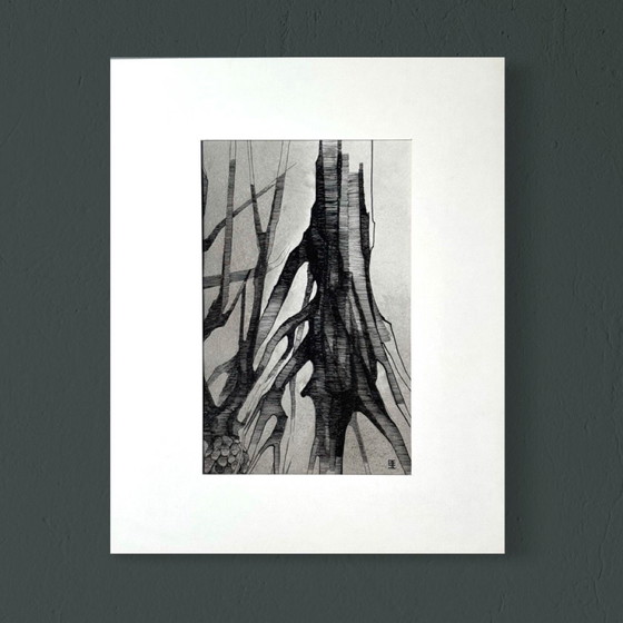 Geïnspireerd door Belgische surrealisten gebruikt Eechaut uitsluitend zwarte inkt om diepte en beweging op te roepen, waarbij hij abstractie combineert met een gevoel van natuurlijke vorm. Het contrast tussen strakke verticale elementen en vloeiende, wortelachtige vormen geeft het werk een dromerige intensiteit.