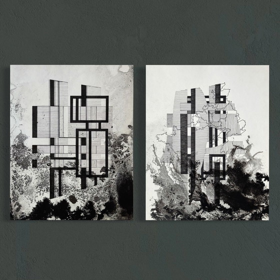 Deze twee opvallende werken van de Belgische kunstenaar Eugène Eechaut zijn gecomponeerd in zijn kenmerkende stijl: een nauwgezet samenspel van inktlijnen en tonale wassingen, wat een architectonisch surrealisme creëert dat geworteld is in abstractie. Eechaut verkent meesterlijk diepte en structuur door middel van contrast en transparantie, waar precisie en expressieve textuur samenkomen.