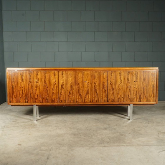 Een prachtig en indrukwekkend groot sideboard/dressoir uit de jaren 60. Dit sideboard is van buiten afgewerkt met een palissander houten fineer en van binnen met prachtig licht esdoornhout. Het meubelstuk heeft zes deurtjes waarachter legplanken en twee lades verborgen zitten. Het sideboard staat op vier robuuste chromen popten. Dus als u een groot en exclusief sideboard zoekt met een minimalistisch design en een enorme hoeveelheid opbergruimte, dan hoeft u niet verder te zoeken! Dit sideboard is in goede vintagestaat met een paar lichte beschadigingen aan het fineer. Aan de linker achterzijde heeft het fineer iets meer schade, maar doordat het bijgekleurd is valt het niet echt op (zie foto’s). Er zijn vier originele sleutels aanwezig. Het meest rechter slotje werk helaas niet meer naar behoren. Deurtje sluit netjes, maar kan niet meer op slot.
