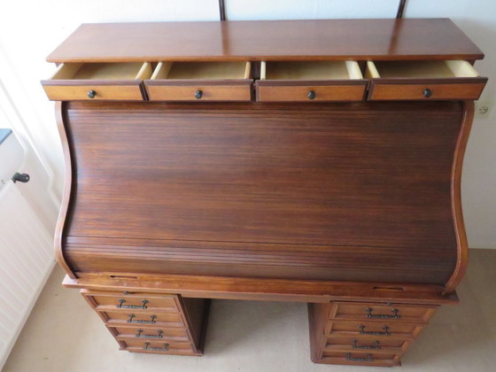 Dit prachtige vintage bureau biedt niet alleen een stijlvolle uitstraling maar ook een overvloed aan opbergruimte. Het warme bruine hout en de klassieke vormgeving maken het een tijdloze toevoeging aan elk interieur.