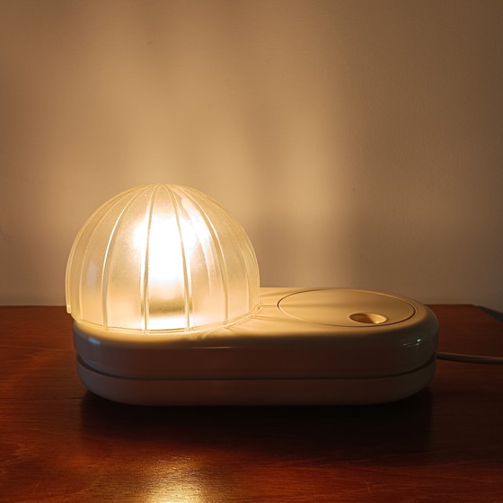 Deze space ace leeftijd met een glazen koepel op een plastic voet heeft een grote draaibare knop om de intensiteit van het licht aan te passen. De lamp kan worden gebruikt als tafellamp en kan ook aan de muur worden bevestigd.