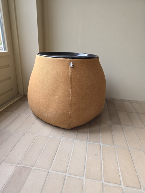 Een poef, een bijzettafel, een opbergplek — zonder compromissen op geen van de drie. Bekleed in warmochere geweven stof. Het afneembare zwarte stalen dienblad functioneert als tafeloppervlak én deksel. Eronder: ruimte voor wat je wilt opbergen. Van binnen een diepgeel thermoplastisch interieur.