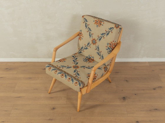Unieke fauteuil uit de jaren 1950. Beukenhouten frame van hoge kwaliteit. De fauteuil is opnieuw bekleed en bedekt met een linnen tafelkleed uit de jaren 1950 met een prachtig patroon. Zeer goed vakmanschap, hoogwaardige materialen, gemaakt in Duitsland.