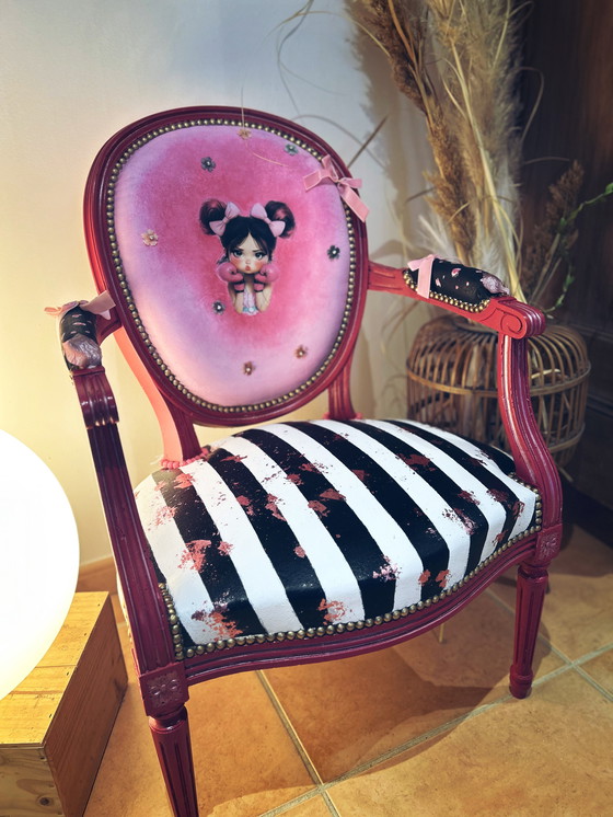 Deze charmante vintage stoel is met zorg gerenoveerd om een jong meisje blij te maken. De levendige roze bekleding, versierd met een speelse illustratie, spreekt tot de verbeelding en geeft elke kamer een vrolijke touch. De zwart-wit gestreepte zitting vormt een mooie aanvulling op het ontwerp en zorgt voor een opvallend contrast dat de stoel extra aantrekkelijk maakt.