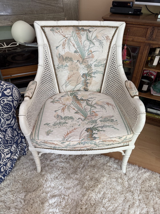 Stap in een wereld van tijdloze elegantie met deze Faux Bamboo Giorgetti stijl stoel, met prachtige singels en een charmante vintage flair. Deze fauteuil is een heerlijke mix van klassiek design en modern comfort, perfect om een vleugje verfijning toe te voegen aan elke kamer. Deze stoel is gemaakt van een frame van imitatiebamboe en heeft ingewikkelde details en een stevige constructie. De prachtige singels aan de zijkanten voegen een unieke textuur toe en vormen een aanvulling op de zachte, op de natuur geïnspireerde stoffen bekleding. De neutrale witte en beige tinten maken hem veelzijdig en passen moeiteloos in verschillende interieurstijlen. Haal dit meubel in huis en laat het een gespreksonderwerp worden, dat jarenlang stijl en comfort biedt.