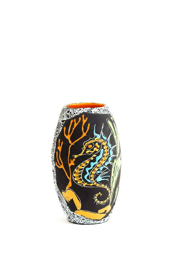 De binnenkant van deze Fiorini Pugi vaas is geglazuurd in een felle oranje kleur. De decoraties lijken met de hand gemaakt en laten een zeepaardje tussen waterplanten zien. De oranje tinten zijn aangevuld met details in blauw en groen. Kortom: een uniek stuk met karakter. Voor de echte verzamelaar!