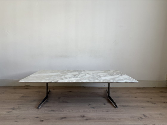 Deze Fly salontafel van Flexform is ontworpen door Antonio Citterio en heeft satijnen metalen poten en een calacatta (goud) marmeren blad. Het marmer is in een prachtige staat. De poten zijn al bewaard in hun beschermhoes.