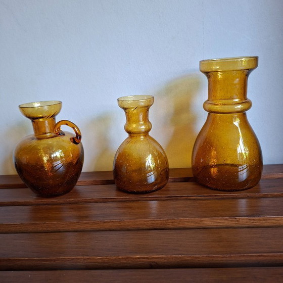 Floris Meydam Etrusk vasen. Set van 3 in mind conditie. Puntgaaf in de kleur amber. Geproduceerd/geblazen in de jaren 70tig in Leerdam. Made in Holland. Tof in een mooi interieur of een super cadeau om voor een bijzonder gelegenheid te schenken.