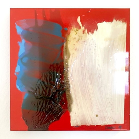 Het werk boeit door zijn buitengewone tactiliteit en materialiteit. Een gevonden, rood gelamineerd houten paneel dient als drager, waarbij de oorspronkelijke kleur het uitgangspunt vormt voor een dynamische compositie. Kloeters gebruikt een combinatie van acrylverf en hoogglanshars om diepte en reflectie te creëren.