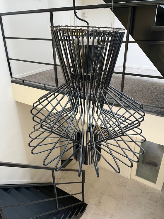 Italiaans top design op het gebied van verlichting, merk opgericht in 1981 in Venetie. Ritmico is van gecoat aluminium + verchroomed metaal. Afmetingen 51x58 cm (bxh), snoerlengte ongeveer 3 meter (hangt in hal aan dank bij ons). Ontwerper is Atelier Oi (lamp is ook te vinden online)