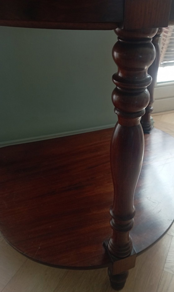 Prachtige Engelse antieke mahony etage/console kast. Met drie etages. Schitterende gedraaide bewerkte poten en klosjes. Er zit een paar krasjes aan de zijkant van het middenblad. En er missen een paar stukjes fineer, weinig zichtbaar zie de 2 laatste foto's. Verder in goede staat gezien de leeftijd. De wandkast is 175 cm hoog. Breedte is 82 cm. Diepte is 62 cm. Gemeten aan het hoogste, breedste en diepste deel. Bovenste blad is 33 cm breed x 23 cm diep. Middelste blad is 85 cm breed x 64 cm diep, dikte van het blad is 15 cm. Onderste blad is 82 cm breed x 62 cm diep. De kast heeft een mooie gewelfde vorm. Gekocht in antiekzaak voor €500.