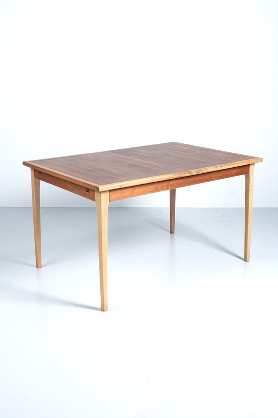 Fraaie uittrektafel met prachtig fineer blad en contrasterende kleur poten (beukenhout). De uittrekbladen van deze tafel zijn heel handig verwerkt in de tafel.In een goede vintage staat.