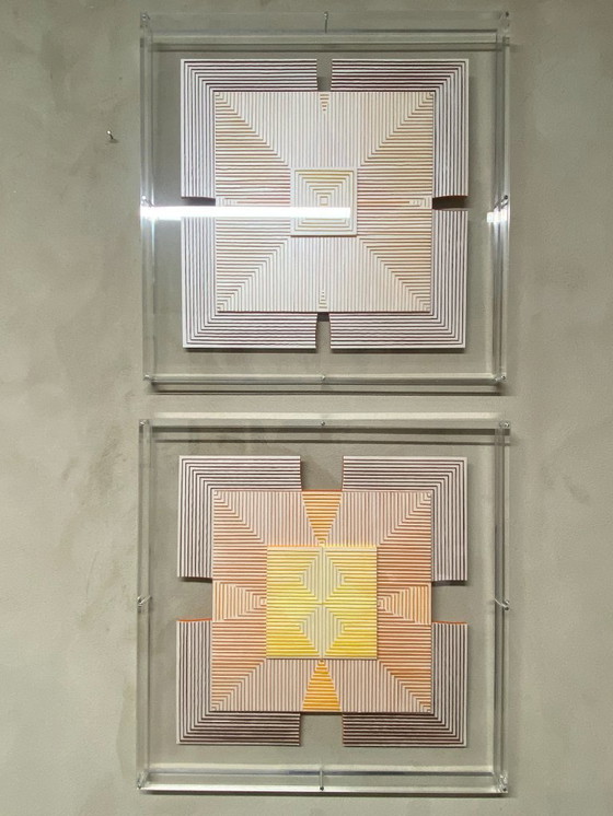 Dit tweeluik, een dubbel kunstwerk, is een gedurfde verkenning van geometrie en kleur. Gedomineerd door warme tinten oranje en geel, presenteert het een indrukwekkende symmetrie, die een betoverende illusie van diepte creëert. De opeenvolgende lagen parallelle lijnen vormen een reeks vierkanten die samenkomen in een lichtgevend centrum, wat een gevoel van dynamische beweging oproept. De lijnen zijn met minutieuze precisie gerangschikt en benadrukken een driedimensionale structuur die naar de kijker toe springt. De kleurkeuze is strategisch, wat een harmonieuze en meeslepende overgang creëert. De transparante lijst creëert een zwevende indruk en accentueert de visuele impact van het geheel. Dit werk verenigt optica en kinetische kunst en toont technisch meesterschap en oogverblindende creativiteit. Het vermogen om met percepties te spelen maakt dit werk een intrigerende en onvergetelijke visuele ervaring.