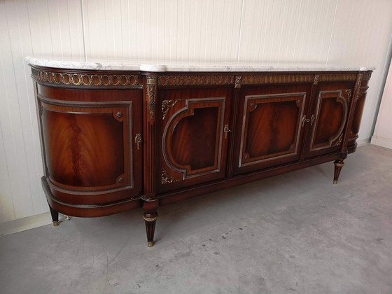 Mahoniehouten dressoir in Lodewijk XVI-stijl, gesigneerd JP Ehalt, met een wit marmeren blad boven een gebogen kast.