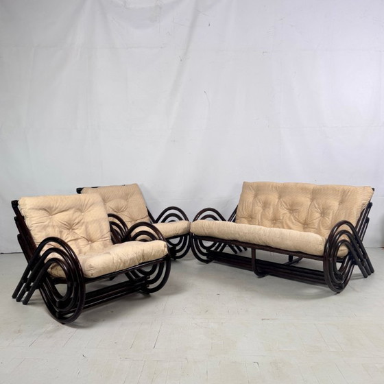 Vintage Franse rotan woonkamerset uit de jaren 70, bestaande uit een bank en twee fauteuils met een uniek sculpturaal ontwerp. De set verkeert in originele staat en vertoont ouderdomssporen, maar is nog steeds stabiel en functioneel. Een charmant voorbeeld van Europees design uit de jaren 70, perfect om elk interieur een retrokarakter te geven.