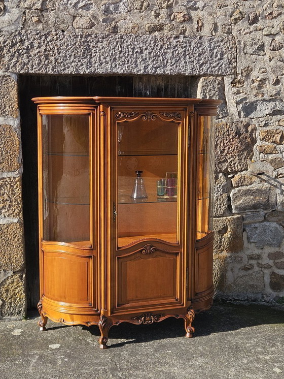 Deze prachtige vintage vitrinekast in Louis XV-stijl is een schitterend meubelstuk van massief kersenhout met gebogen glazen panelen en weelderige, gesneden decoraties die typerend zijn voor dit tijdperk.