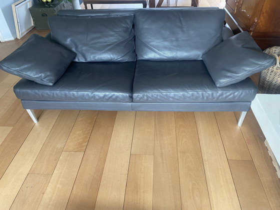 Zwartlederen designer sofa met aluminium pootjes, met instelbare hoofdsteunen en (verborgen) voetenbankje, gebruikt maar in zeer goede staat, ongeveer een jaar geleden via Whoppa aangekocht maar past niet meer in huidig interieur