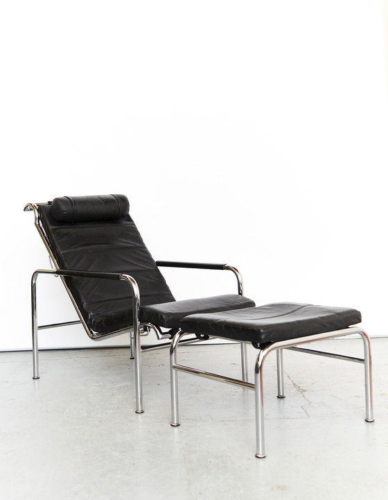 Staat: Frame van verchroomde stalen buizen. Kussen bekleed met zwart echt leer. Zitpositie verstelbaar. Er is een kleine beschadiging aan het leer op de voetenbank.