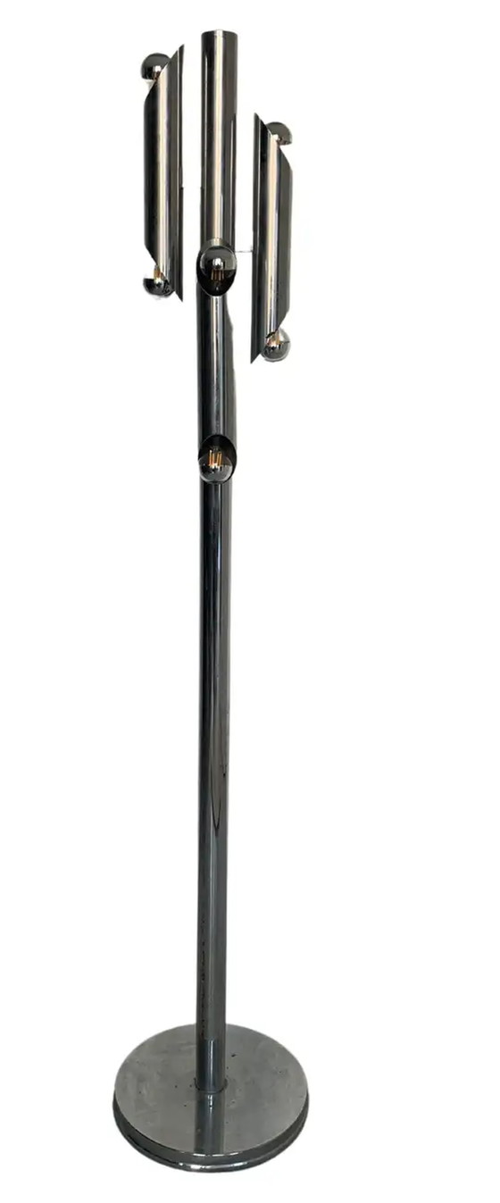 Hij werkte bijna alleen met metaal en zijn beroemdste en meest gewaardeerde ontwerpen zijn die in verzilverde buizen, kubussen of bollen - zowel glanzend/verchroomd als mat. Hij confronteerde zich met allerlei soorten verlichting, van kroonluchters en schansen tot vloer- en tafellampen. Het aangeboden stuk is inderdaad een vloerlamp, met een ronde voet, een centrale schacht en acht lampen aan de bovenkant, paarsgewijs bevestigd rond de schacht.