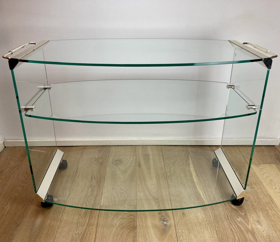 De Italiaanse designers Gallotti & Radice ontwierpen deze elegante serveerwagen in de jaren 1970. De trolley bestaat uit stevige glazen platen, verbonden door chromen details. De sierlijke handvatten maken het makkelijk te verplaatsen. De bar cart vertoont lichte gebruikssporen zoals krasjes op het glas en verkleuring/patina op de chromen delen.