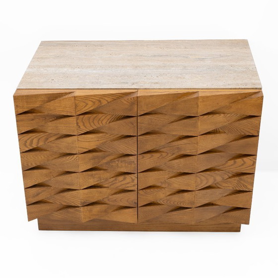 Sculptuurvol en getextureerd, dit eikenhouten dressoir valt op door zijn driedimensionale voorkant, bestaande uit een reeks geometrische volumes die het licht op steeds wisselende wijze vangen en reflecteren.