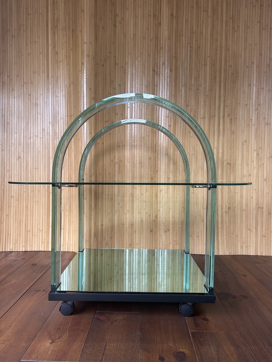 Een Italiaanse moderne bar- of theewagen uit de jaren 80 van glasblazerij Fiam. De wagen heeft een spiegelende bodem en een zwaar gebogen glazen handvat. Hij heeft een zwart metalen onderstel met een spiegelende binnenkant en staat op wieltjes. Geëtst meesterteken op de voet van de poot: 'Fiam Pesaro'. In zeer goede staat. Een minuscuul chipje op de losse glasplaat.
