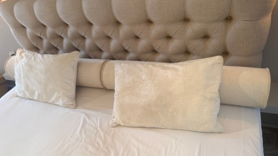 gecapitoneerd bedhoofd (linnen) met bijhorende bekrok en sierkussens
