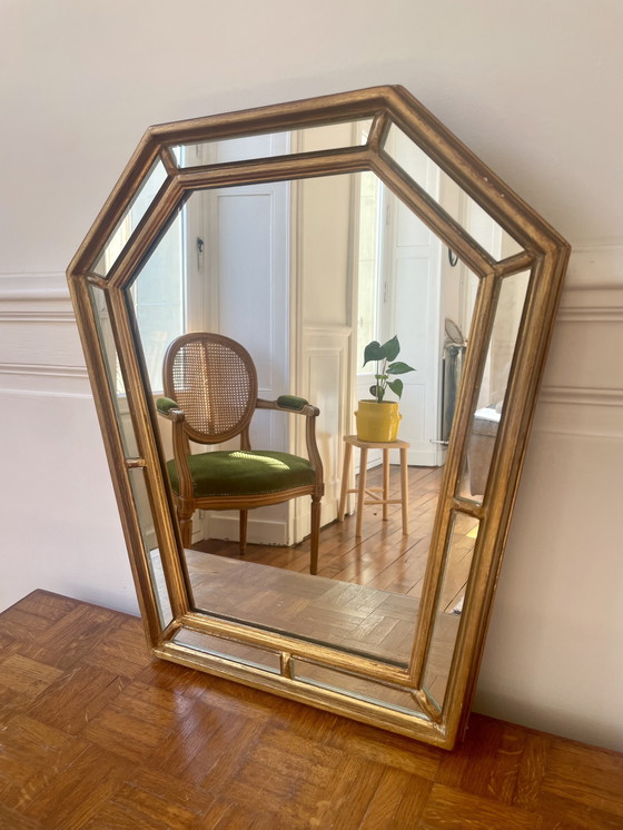 Deze vintage zeshoekige spiegel belichaamt klassieke elegantie, met zijn geglazuurde ontwerp dat typisch is voor mooie interieurs uit die periode. De vergulde houten lijst geeft hem een tijdloze charme die zowel traditionele als hedendaagse interieurs zal aanvullen.
